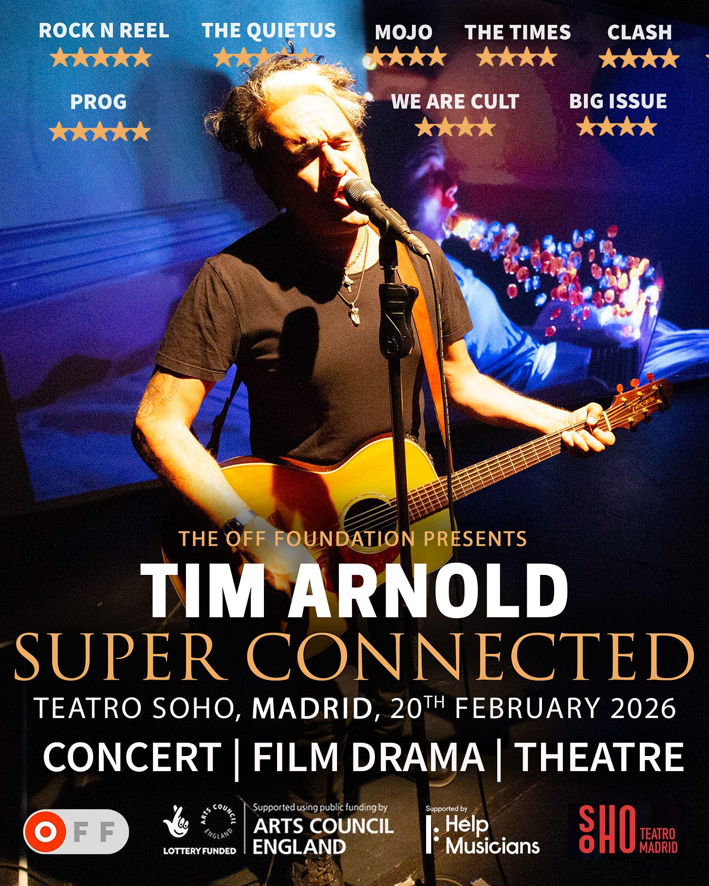 Tim Arnold is a British rock artist whose work sits at the intersection of music, film, and theatre. Best known for Super Connected — a critically acclaimed live multimedia work (The Times ★★★★ Mojo ★★★★) feature film, and album — his recent work has focused on the cultural and psychological impact of the digital age, particularly on young people, families, and education.